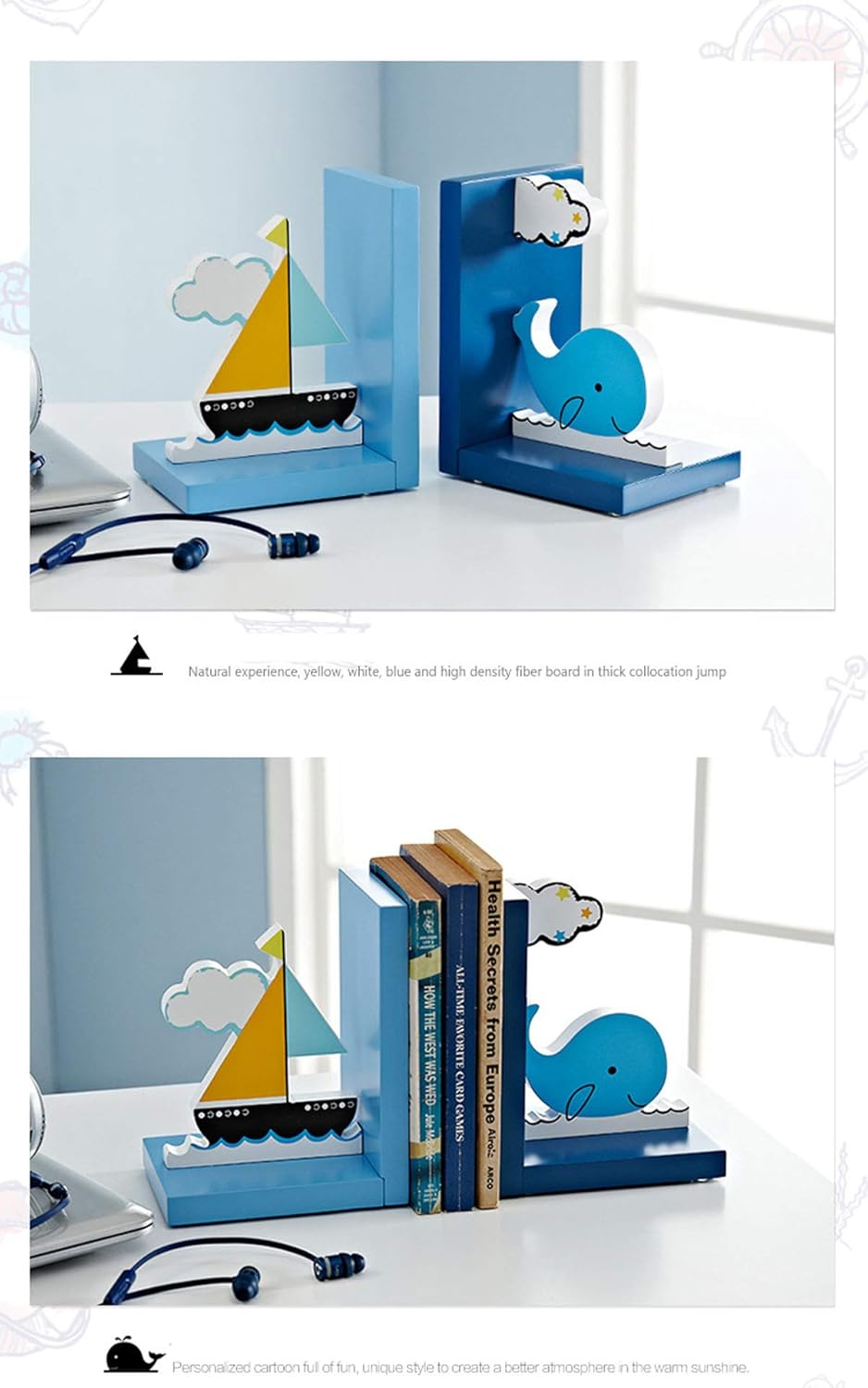 This charming set of bookends features little elephant and giraffe detailing in white and blue;It matches animals themed room very well. A charming design for any little boys and girls cartoon animal themed room.