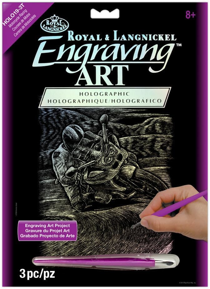 Royal & Langnickel Engraving Art makes it easy to be an artist Simply use the tool in the kit to scrape away the preprinted design, revealing holographic colors below. In no time patterns come to life with realistic depth, dimension and textures. With the design preprinted onto the board, there is no need to worry about subject. The 8-inch by 10-inch format works beautifully in standard frames when completed. Engraving Art are ideal for children, adults and everyone between. And, because there's no paint and brushes, they make the ideal travel art project.